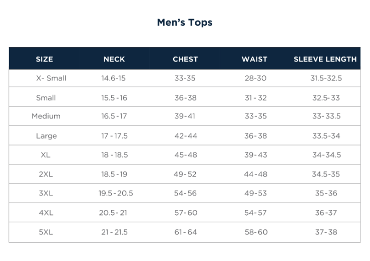 | Chest | 36-38 | 39-41 | 42-44 | 45-48 | 49-52 | 54-56 | 57-60 | 61-64 |