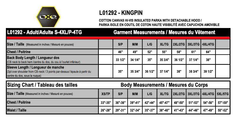330 gsm – 9.7 oz./yd2 – 16.5 oz./lin. yd 100% cotton canvas with water repellent finish. Insulation: 220 gsm body, 170 gsm sleeves 100% polyester. Full body thermal quilted insulation. Snap detachable hood with adjustable drawcord. Rib knit storm cuff. 7 exterior pockets - 2 chest pockets, 2 side entry pockets, 2 lower front patch pockets with flap and 1 pocket on sleeve. Two interior pockets. YKK zipper. 4” hi-vis contrast band with 2” reflective tape on front and back body and sleeves. Meets CSA standards.